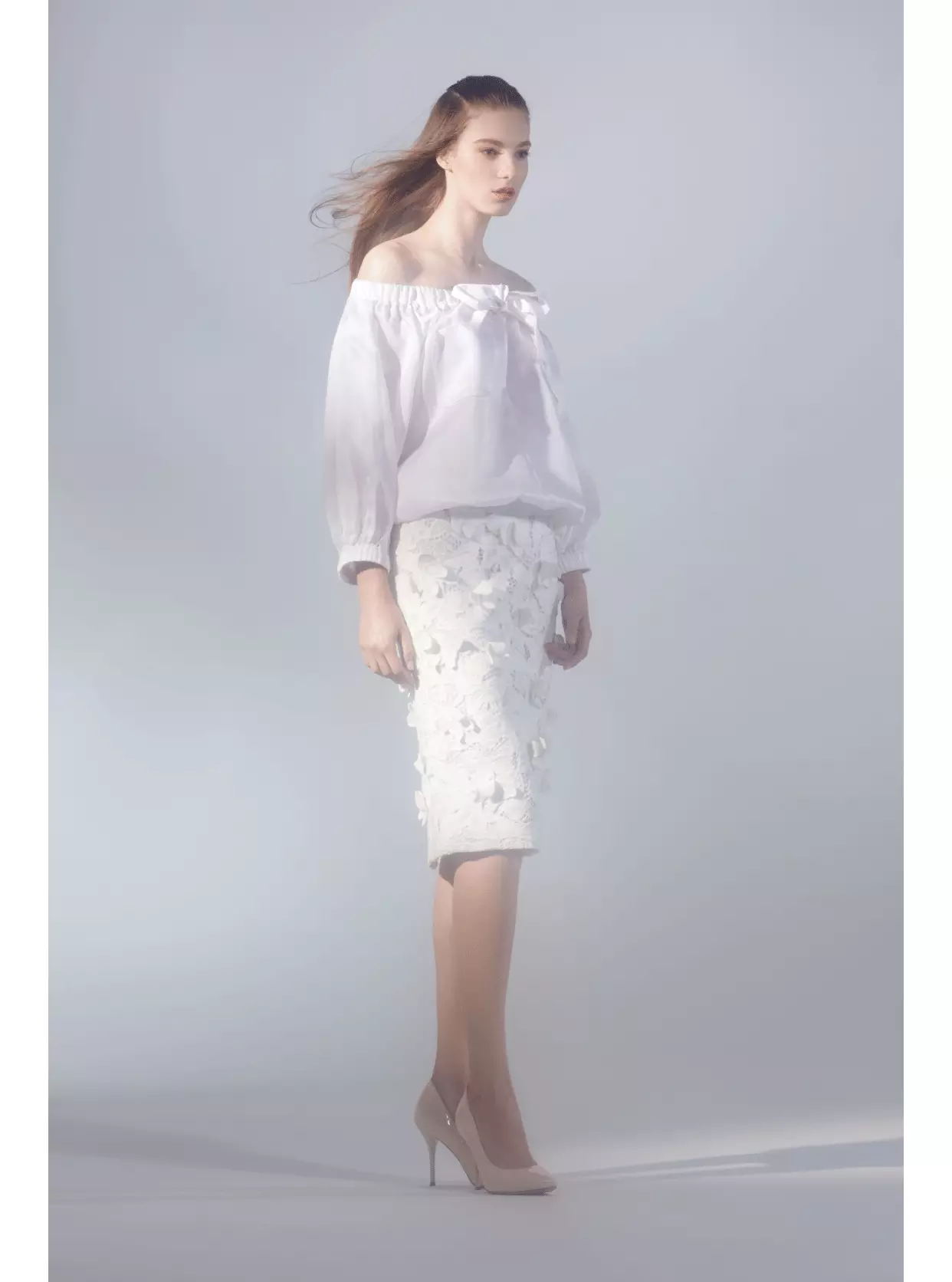 秀发轻拂的肩,回眸扭转的肩,都是一道令人怦然心动的风景。圣洁纯白的抹胸裙将高级时装感轻松营造。自然盛开状的花瓣造型赋予时装崭新的灵魂。从上至下顺直流畅的自然褶型,每一道均为手工固定,匠心精神于裙袂间缓缓流淌。