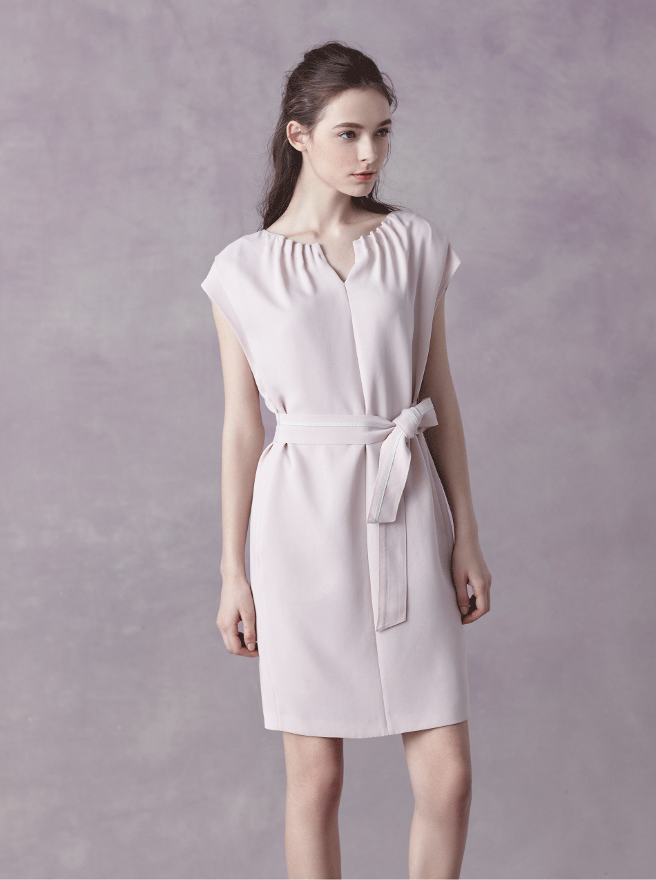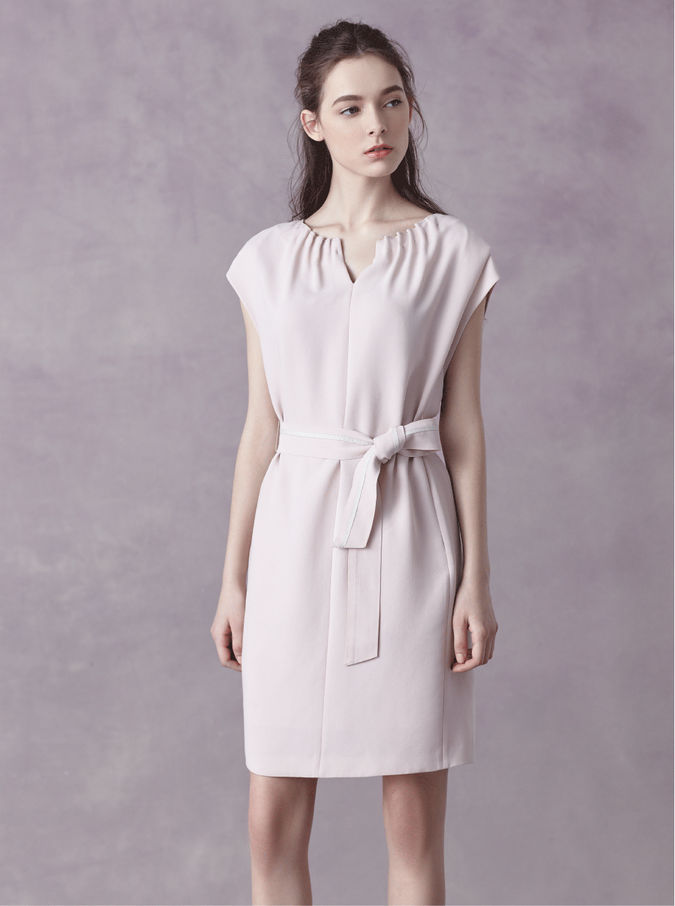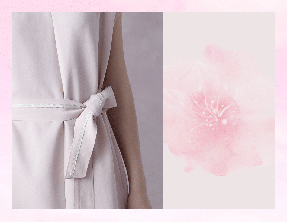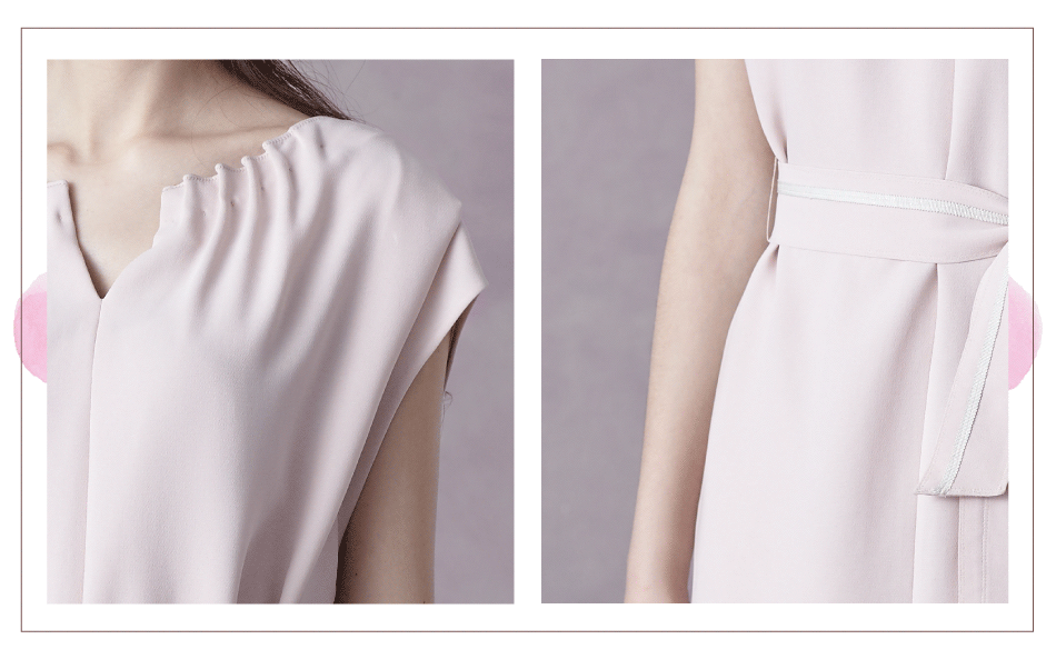 领部顺褶设计,在模仿古代汉服裙设计的同时,运用淡山茱萸粉打造柔美印象。并不浮夸的V字型开领,锁骨诱惑呼之欲出,小性感是打开幸福之门不可或缺的小心机!